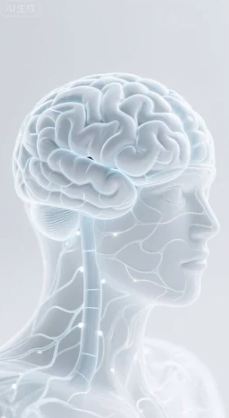 ✨ 提示词一(聚焦神经结构):半透明的3D人体大脑神经网络特写,科技感,背景为白色,极简设计。