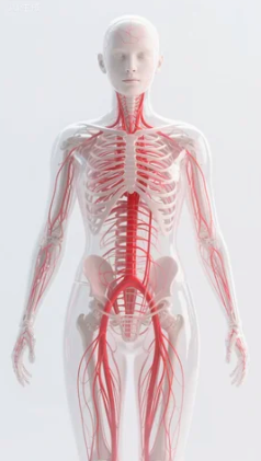 ✨ 提示词三(突出循环系统):AI数字艺术,透明人体模型,全身,科技感,红色血管,高清细节,白色背景。