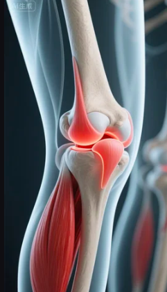 ✨ 提示词四(局部骨骼肌肉):AI数字艺术,半透明的人体骨骼3D模型,近距离聚焦于膝关节,肌肉突出显示为红色。