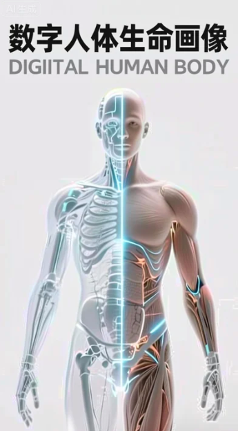 ✨ 提示词五(海报级设计):AI数字艺术,高级感海报,时代周刊风格,高级感。左半边身体是透明人体模型,右半边身体是真实的人体模型,全身,科技感,高清细节,白色背景。文字排版,设计感,英文“Digital Human Body”,主标题:数字人体生命画像。