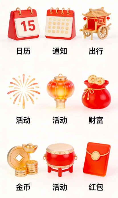 具体icon是:日历、通知(用台历表示)、出行(古代马车表示)、活动(用花灯表示)、活动(烟花表示)、财富(用红色钱袋表示)、金币(支付表示)、活动(大鼓表示)、红包;