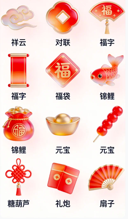 🔥提示词:清新可爱的图标风格,扁平化,多细节高质量,采用红色、黄金色低饱和度的色调,元素具有通透的渐变层次与立体质感。元素细节与布局;