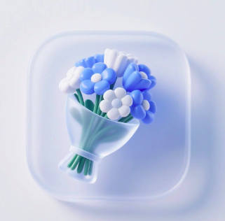 5、提示词: (只需更改红字部分)一束鲜花的图标,icon,材质透明,蓝白色配色,磨砂玻璃质感,透明感,UI、UX设计风格,等轴测视角,纯白色背景,影棚灯光,色彩明亮,3D艺术,使用C4D 软件制作,配合OC渲染器,Pinterest、细节,高清Dribbble、behance.