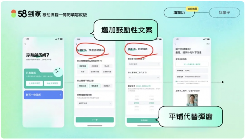 第一,流程再造,化繁为简。我们把原来复杂的 10 步流程大胆缩减成了 4 步。同时,还会通过 “仅需 2 步,就差 1 步” 这样的实时进度反馈和鼓励性文案,给阿姨们加油打气,让她们清楚了解进度,管理好心理预期。