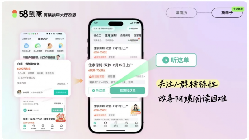 一方面,优化核心场景,聚焦目标。把信息繁杂的 “接单大厅” 改造成了清爽又高效的 “机遇广场”,去掉了广告等干扰信息,还把字号放大,让阿姨们看得清、看得懂。