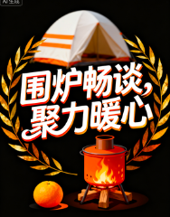 7、提示词: 字体设计标志“围炉畅谈,聚力暖心”,创意字体设计,线条流畅且富有艺术感,将字体进行抽象变形,创造出独特的节奏和动感,给人以强烈的视觉冲击。加入秋叶,火炉,帐篷,橘子等野外聚餐和秋季等装饰元素,白色加橙色缀,高级感,黑色背景