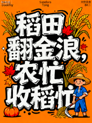 8、提示词: 字体设计,涂鸦字体,文字“稻田翻金浪,农忙收稻忙”,不规则笔触,打破常规,创意设计,元素点缀,秋天活泼可爱的元素在里面,收割小麦的农民,纯色背景
