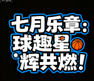 4、提示词: 字体设计,纯黑背景,创意字体设计“七月乐章:球趣星辉共燃!”,白色字体,蓝色加黑色粗边线,轻松夏日风格,创意可爱体矢量插画,篮球、乒乓球等小元素穿插字体中