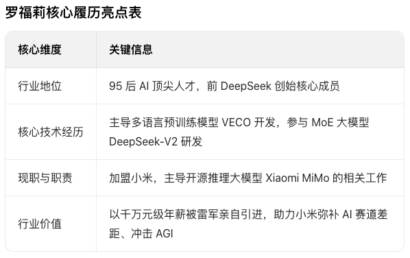此次引援由小米创始人雷军亲自推动,曾传出开出千万元级年薪的重磅条件,背后是小米弥补 AI 赛道起步差距、发力核心技术的决心。罗福莉拥有丰富的大模型研发经验,曾主导多语言预训练模型 VECO 开发,还参与过 MoE 大模型 DeepSeek-V2 的研发,目前已快速投入小米团队工作。