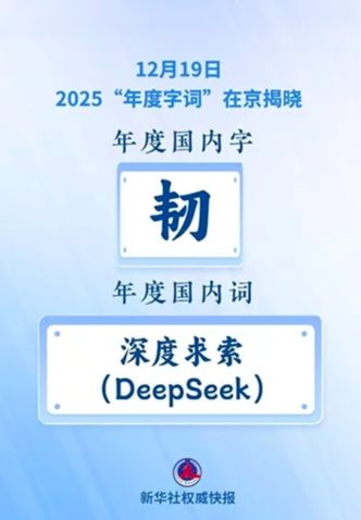 新华社联合多部门重磅发布 “汉语盘点 2025” 结果,年度国内字 “韧” 与年度国内词 “深度求索(DeepSeek)” 脱颖而出,精准勾勒年度精神内核与产业趋势。