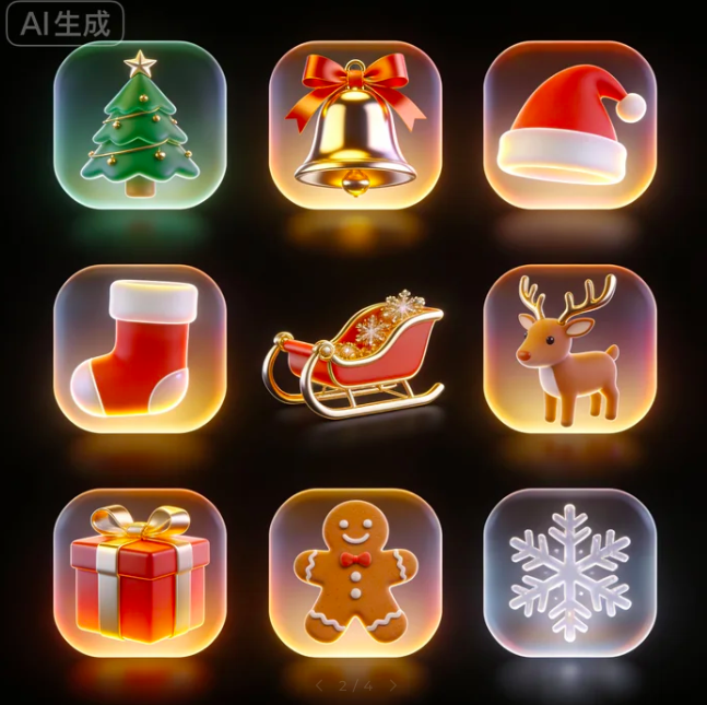 圣诞主题3D轻拟物图标。9个不同形态圣诞主题图标(圣诞树、圣诞袜、圣诞帽、铃铛、雪橇、麋鹿、礼物盒、姜饼人、雪花),平铺式排列展示,悬浮漂浮效果;弥散渐变风格贯穿整体,主体边缘带有柔和轮廓光与微微边缘光,内部叠加半透内发光质感;部分元素(铃铛、礼物盒丝带、雪橇装饰)采用黄金金属材质,呈现强烈高光高亮效果,搭配柔和漫反射质感,光泽层次丰富;背景色值为黑色,无任何多余杂物;三维质感突出,3D材质纹理清晰可辨,主体物与背景对比强烈,边缘干净利落,方便后期抠图,整体风格简洁精致、氛围温馨。