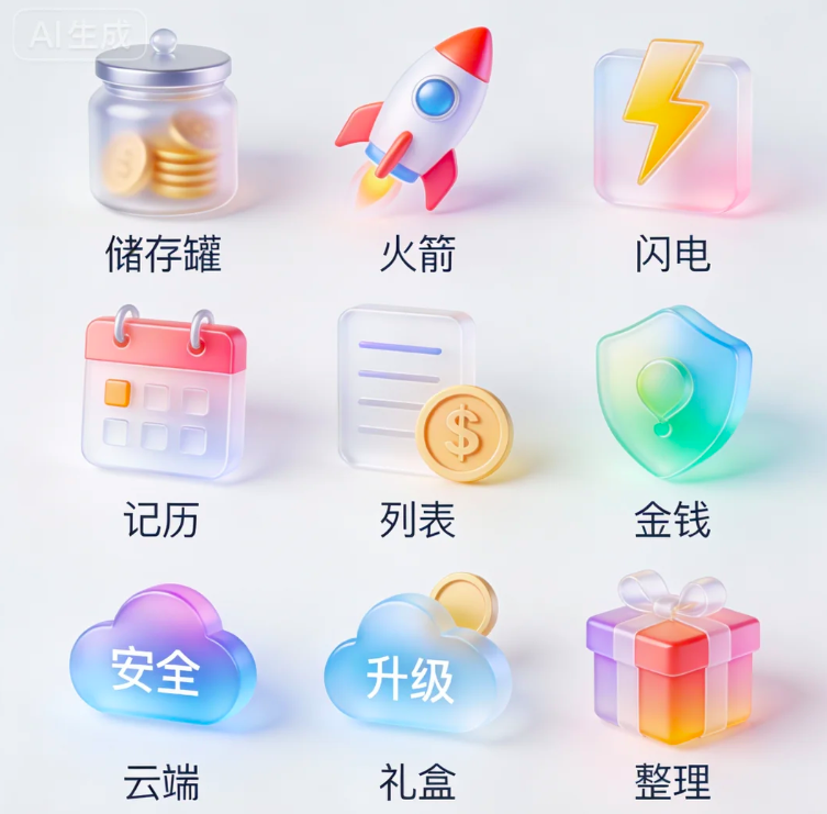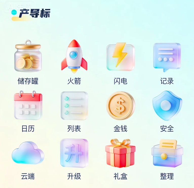清新可爱的图标风格,扁平化,多细节,高质量,采用多彩低饱和度的色调,元素具有通透的渐变层次与立体质感,适配金融货款场景,帮助用户,企业高效协同,实现在借款环节全方位管理。元素细节与布局:图标集合:共10个图标,排列成矩阵,每个图标造型清新可爱且紧扣金融场景核心元素,表意精准,下方配有中文功能标签。具体功能覆盖:包含储存罐、火箭、闪电、记录、日历、列表、金钱、安全、云端、升级、礼盒、整理。视觉特点:多彩低饱和度色调协调统一,多彩层次强化金融场景的专业感适合用于金融 APP的功能分类或界面导航场景,满足高辨识度、现代化的视觉需求