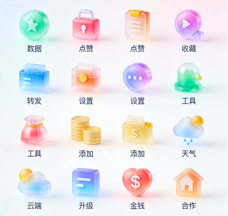 清新可爱的图标风格,扁平化,多细节,高质量,采用多彩低饱和度的色调,元素具有通透的渐变层次与立体质感,适配金融货款场景,帮助用户,企业高效协同,实现在借款环节全方位管理。元素细节与布局: 图标集合: 共10个图标,排列成矩阵,每个图标造型清新可爱且紧扣金融场景核心元素,表意精准,下方配有中文功能标签。具体功能覆盖: 包含: 数据、点赞、收藏、转发、设置、工具、添加、天气、云端、升级、金钱、合作。视觉特点:多彩低饱和度色调协调统一,多彩层次强化金融场景的专业感,适合用于金融 APP 的功能分类或界面导航场景,满足高辨识度、现代化的视觉需求