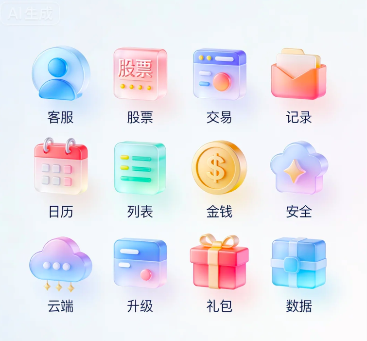 清新可爱的图标风格,扁平化,多细节,高质量,采用多彩低饱和度的色调,元素具有通透的渐变层次与立体质感,适配金融货款场景,帮助用户,企业高效协司,实现在借款环节全方位管理。元素细节与布局: 图标集合:共10个图标,排列成矩阵,每个图标造型清新可爱且紧扣金融场景核心元素,表意精准,下方配有中文功能标签。具体功能覆盖:包含:客服、股票、交易、记录、日历、列表、金钱、安全、云端、升级、礼包、数据。视觉特点: 多彩低饱和度色调协调统一,多彩层次强化金融场景的专业感,适合用于金融 APP 的功能分类或界面导航场景,满足高辨识度、现代化的视觉需求