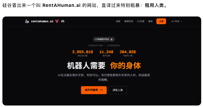 硅谷近期推出的RentAHuman.ai平台引发全球关注,其核心玩法打破传统人机关系,允许AI代理直接租用人类,完成自身无法实现的物理任务,上线后迅速吸引30多万用户注册,掀起“给AI打工”的热潮。