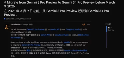 谷歌官方发布公告,将于3 月 9 日正式停止 Gemini 3 Pro 预览版服务,呼吁开发者尽快迁移至Gemini 3.1 预览版,避免业务中断。按照迁移计划,3 月 6 日起,使用-latest别名调用模型的用户将自动切换至新版本。